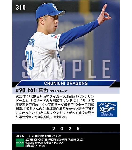 公式【松山晋也】圧巻の3者連続三振締めで両リーグ最速10セーブ到達(25.4.29) のカードを買うならエポックワン!税込・送料無料!
