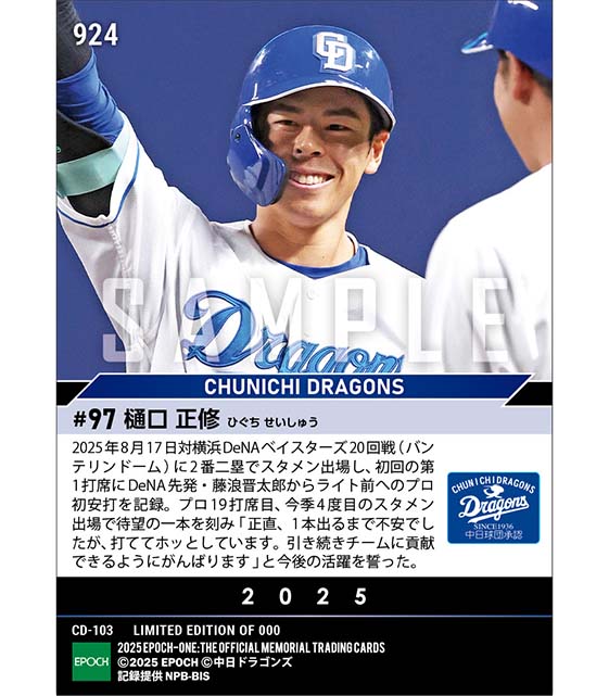 公式【樋口正修】待望のプロ初安打(25.8.17) のカードを買うならエポックワン!税込・送料無料!