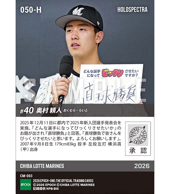 公式※ホロスペクトラ RC【奥村頼人】新入団発表(ドラフト3巡目)「直球勝負で皆さんをびっくりさせたい」(25.12.11) のカードを買うならエポックワン!税込・送料無料!