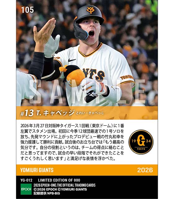 公式【キャベッジ】2026シーズン12球団最速ホームラン(26.3.27) のカードを買うならエポックワン!税込・送料無料!