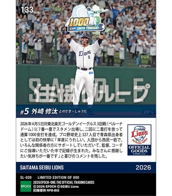 公式【外崎修汰】青森出身初の通算1000安打達成(26.4.5) ※ランダムで 1of1 大当たりカード発送対象 のカードを買うならエポックワン!税込・送料無料!