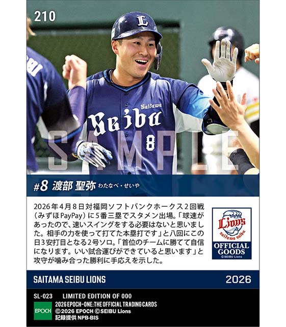 公式【渡部聖弥】値千金2号ソロ含む猛打賞(26.4.8) のカードを買うならエポックワン!税込・送料無料!
