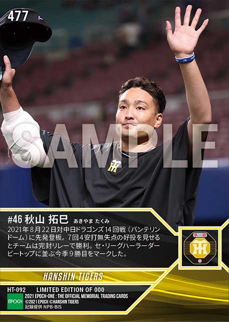 公式【秋山拓巳】7回零封でリーグトップタイ9勝目(21.8.22) のカードを買うならエポックワン!税込・送料無料!
