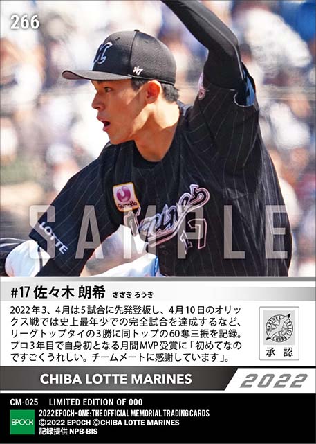 公式【佐々木朗希】2022度 大樹生命月間MVP賞 パシフィック・リーグ3、4月度投手部門(22.5.13) のカードを買うならエポックワン!税込・送料無料!