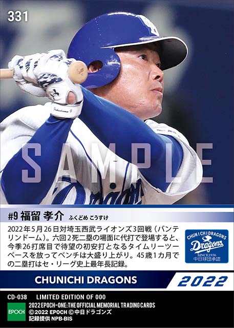 公式【福留孝介】今季初安打となるタイムリーツーベース(22.5.26) のカードを買うならエポックワン!税込・送料無料!