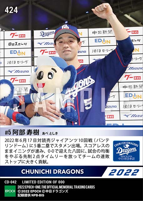 公式【阿部寿樹】値千金先制決勝タイムリー(22.6.17) のカードを買うならエポックワン!税込・送料無料!