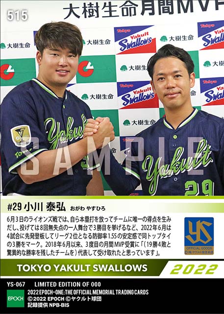 公式【小川泰弘】2022年度 大樹生命月間MVP賞 セントラル・リーグ6月度投手部門(22.7.8) のカードを買うならエポックワン!税込・送料無料!