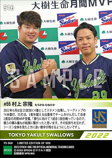 公式【村上宗隆】2022年度 大樹生命月間MVP賞 セントラル・リーグ6月度打者部門(22.7.8) のカードを買うならエポックワン!税込・送料無料!