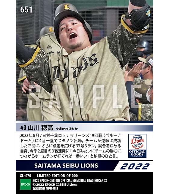 公式【山川穂高】3戦連発となる33号3ラン「ライオンズフェスティバルズ2022」(22.8.7) のカードを買うならエポックワン!税込・送料無料!
