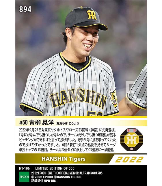 公式【青柳晃洋】自己最多タイでハーラー単独トップに立つ13勝目(22.9.27) のカードを買うならエポックワン!税込・送料無料!