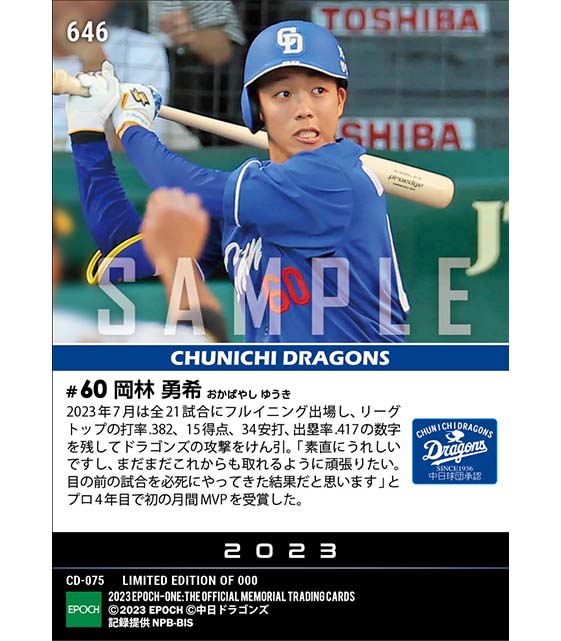 公式【岡林勇希】2023年度 大樹生命月間MVP賞 セントラル・リーグ7月度打者部門(23.8.9) のカードを買うならエポックワン!税込・送料無料!