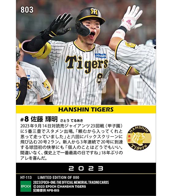 公式【佐藤輝明】左打者史上初となる新人から3年連続20本塁打到達(2023シーズンリーグ優勝決定試合)(23.9.14) のカードを買うならエポックワン!税込・送料無料!