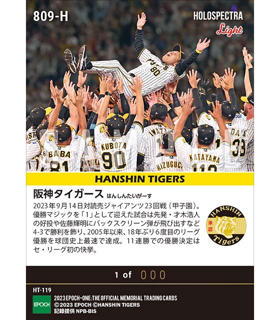 公式※ホロスペクトラLight【阪神タイガース】2023シーズン セントラル・リーグ優勝(18年ぶり6度目)(23.9.14) のカードを買うならエポックワン!税込・送料無料!