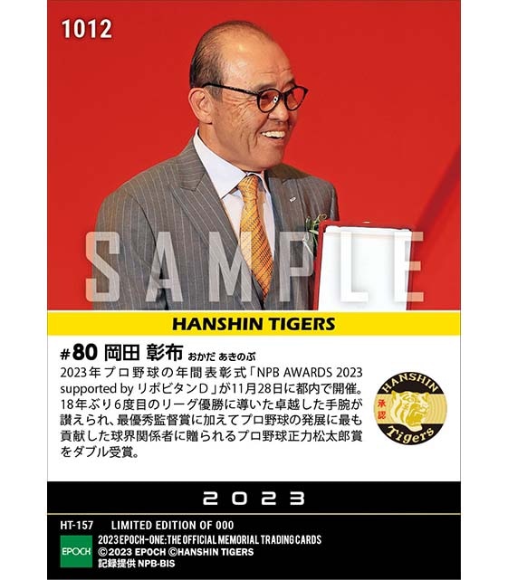 公式【岡田彰布】プロ野球正力松太郎賞、最優秀監督賞「NPB AWARDS 2023 supported by リポビタンD」(23.11.28) のカードを買うならエポックワン!税込・送料無料!