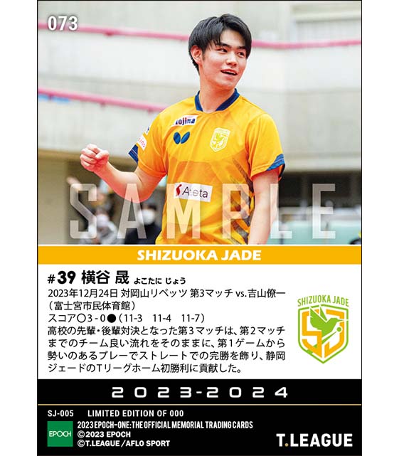 公式【横谷 晟】完勝でチームのTリーグホーム初勝利に貢献(23.12.24) のカードを買うならエポックワン!税込・送料無料!