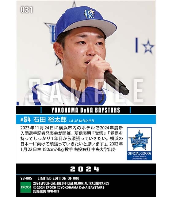 公式RC【石田裕太郎】新入団選手発表(ドラフト5巡目)「日本一に向けて頑張っていきたい」(23.11.24) のカードを買うならエポックワン!税込・送料無料!