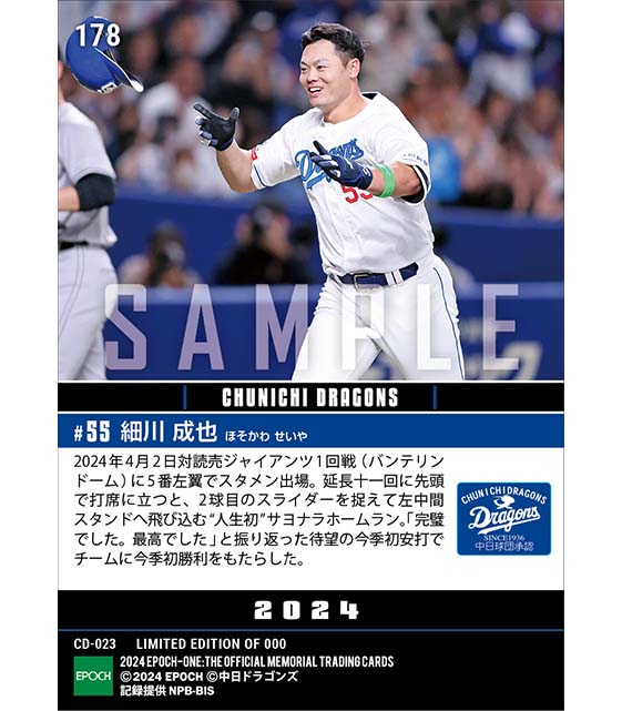 公式【細川成也】待望の今季初安打がプロ初サヨナラ弾(24.4.2) のカードを買うならエポックワン!税込・送料無料!
