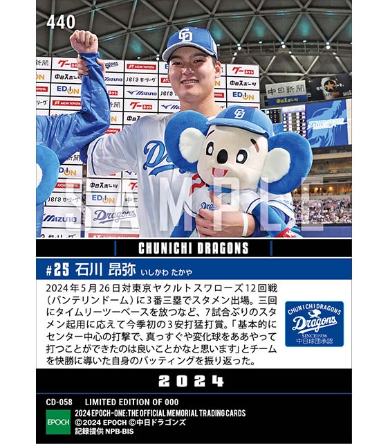 公式【石川昂弥】タイムリー含む今季初猛打賞(24.5.26) のカードを買うならエポックワン!税込・送料無料!