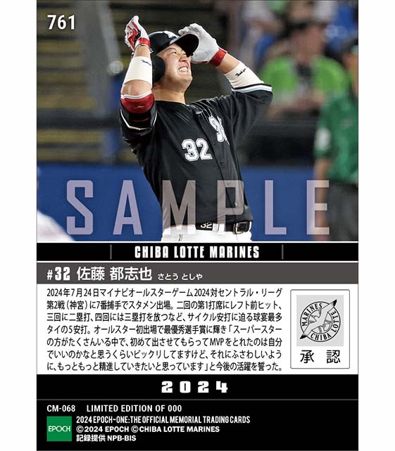 公式【佐藤都志也】サイクル安打に迫る球宴最多タイ5安打で最優秀選手賞「マイナビオールスターゲーム2024」(24.7.24) のカードを買うならエポックワン!税込・送料無料!