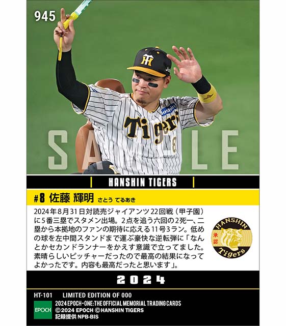 公式【佐藤輝明】長期ロード明けの甲子園を沸かせる起死回生逆転決勝弾(24.8.31) のカードを買うならエポックワン!税込・送料無料!