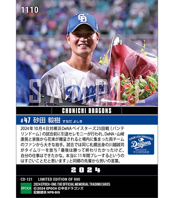 公式【砂田毅樹】引退セレモニーで現役生活にピリオド(24.10.4) のカードを買うならエポックワン!税込・送料無料!