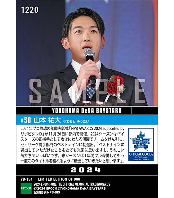 公式【山本祐大】ベストナイン賞(捕手)「NPB AWARDS 2024 supported by リポビタンD」(24.11.26) のカードを買うならエポックワン!税込・送料無料!