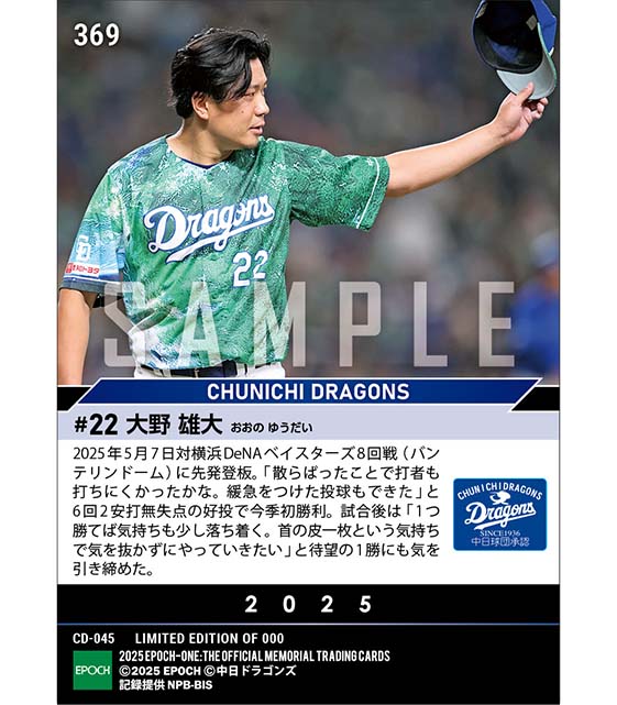 公式【大野雄大】チームの連敗を止める今季初勝利(25.5.7) のカードを買うならエポックワン!税込・送料無料!