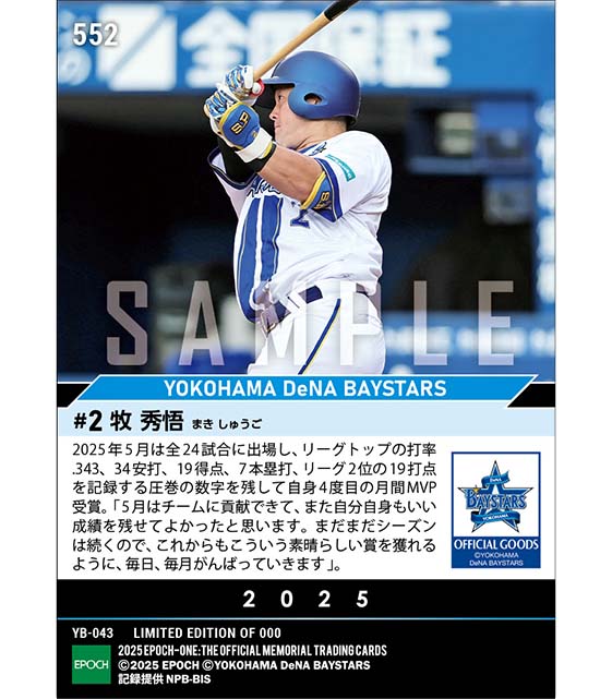 公式【牧 秀悟】2025年度 大樹生命月間MVP賞 セントラル・リーグ5月度打者部門(25.6.11) のカードを買うならエポックワン!税込・送料無料!