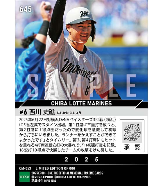 公式RC【西川史礁】4打席連続安打でプロ初猛打賞(25.6.22) のカードを買うならエポックワン!税込・送料無料!