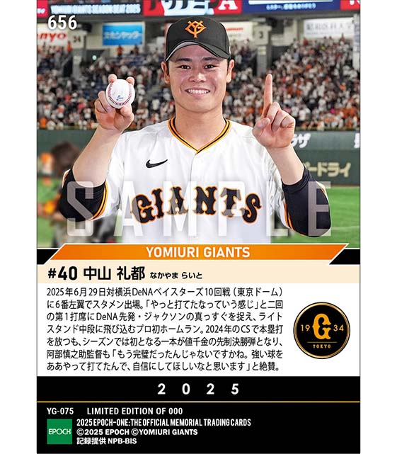 公式【中山礼都】値千金のプロ初本塁打(25.6.29) のカードを買うならエポックワン!税込・送料無料!