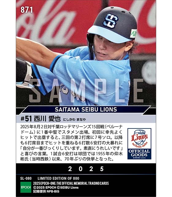 公式【西川愛也】球団70年ぶりの1試合6安打(25.8.2) のカードを買うならエポックワン!税込・送料無料!