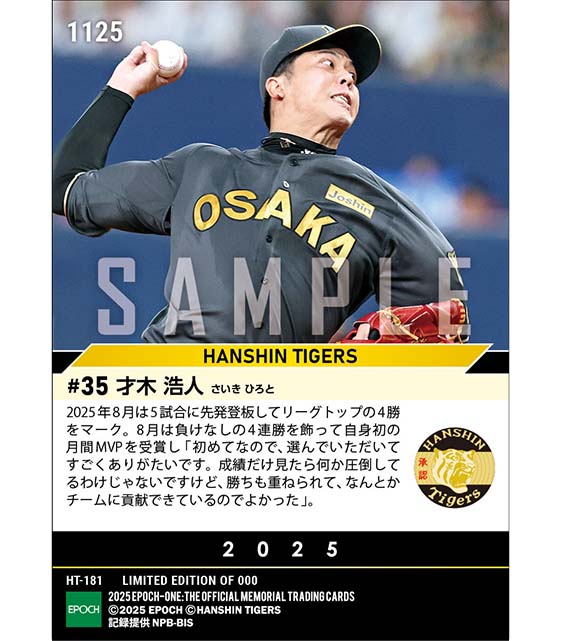 公式【才木浩人】2025年度 大樹生命月間MVP賞 セントラル・リーグ8月度投手部門(25.9.10) のカードを買うならエポックワン!税込・送料無料!
