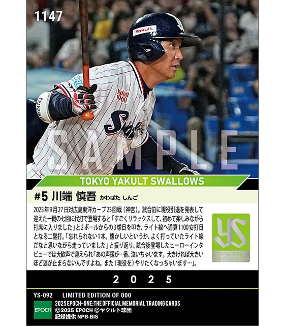 公式【川端慎吾】大歓声に応える今季初打席初安打(25.9.27) のカードを買うならエポックワン!税込・送料無料!