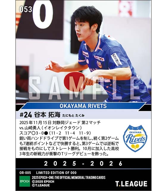 公式RC【谷本拓海】衝撃のTリーグ初出場初勝利(25.11.15) のカードを買うならエポックワン!税込・送料無料!