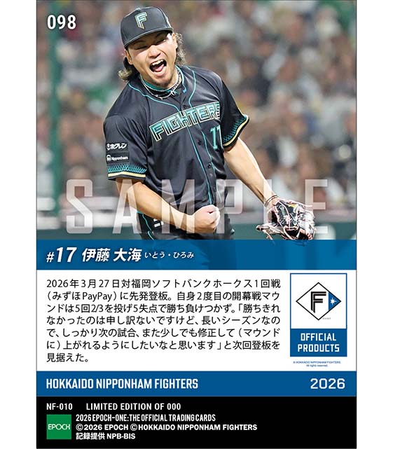 公式【伊藤大海】2026シーズン開幕投手(2年ぶり2度目)(26.3.27) のカードを買うならエポックワン!税込・送料無料!