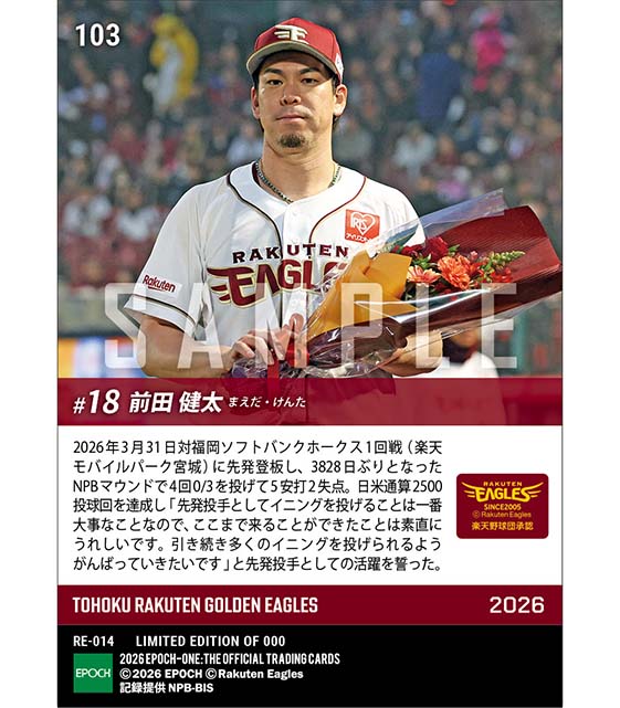 公式【前田健太】東北開幕戦で移籍後初登板(日米通算2500投球回達成)(26.3.31) のカードを買うならエポックワン!税込・送料無料!