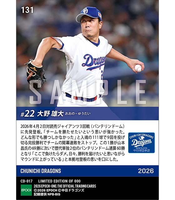 公式【大野雄大】魂の今季初登板初完投初勝利(26.4.2) のカードを買うならエポックワン!税込・送料無料!
