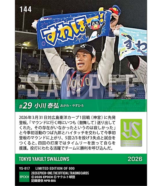 公式【小川泰弘】今季初登板初勝利&自援タイムリー(26.3.31) のカードを買うならエポックワン!税込・送料無料!