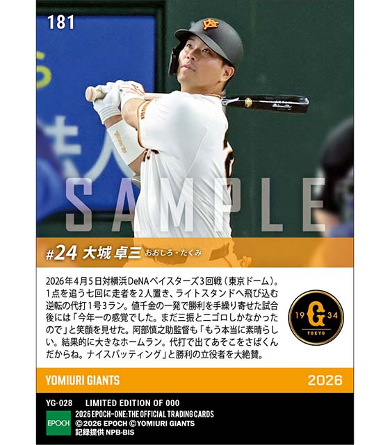 公式【大城卓三】今季初安打となる代打逆転決勝弾(26.4.5) のカードを買うならエポックワン!税込・送料無料!