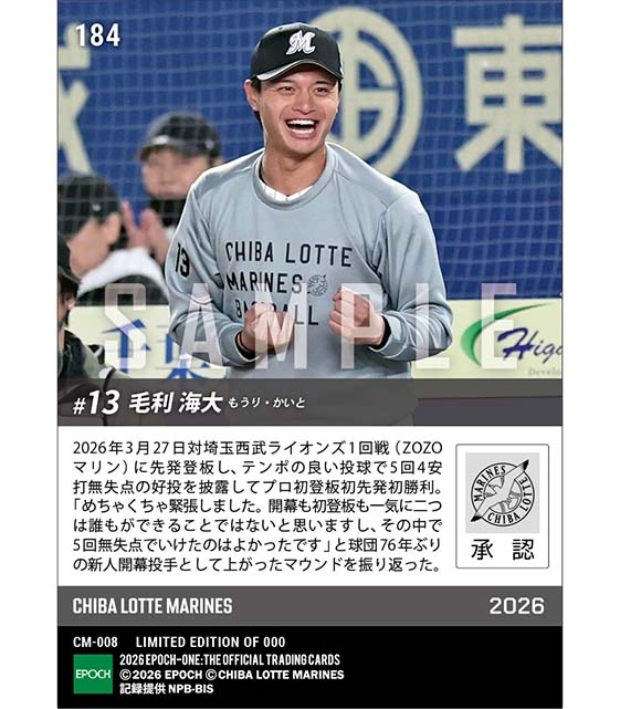 公式RC【毛利海大】球団76年ぶりの新人開幕投手としてプロ初勝利(26.3.27) ※ランダムで 1of1 大当たりカード発送対象 のカードを買うならエポックワン!税込・送料無料!