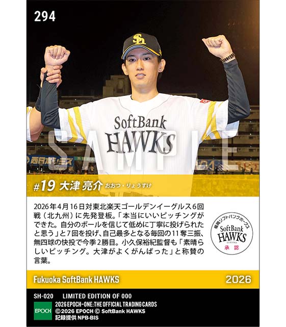 公式【大津亮介】自己最多11奪三振の力投で7回零封(26.4.16) のカードを買うならエポックワン!税込・送料無料!