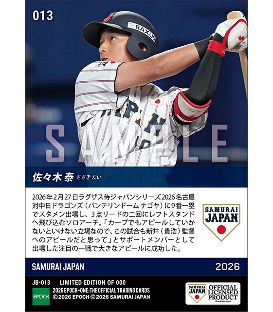 公式【佐々木 泰】代表ユニフォームで豪快弾(26.2.27) のカードを買うならエポックワン!税込・送料無料!